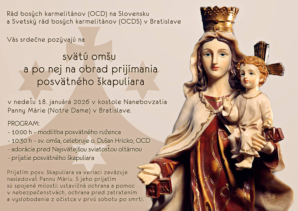 Rád bosých karmelitánov (OCD) na Slovensku a Svetský rád bosých karmelitánov (OCDS) v Bratislave Vás srdečne pozývajú na svätú omšu, po ktorej bude možnosť prijať posvätný škapuliar.