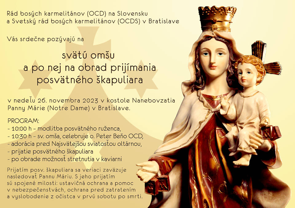ád bosých karmelitánov (OCD) na Slovensku a Svetský rád bosých karmelitánov (OCDS) v Bratislave Vás srdečne pozývajú na svätú omšu, po ktorej bude možnosť prijať posvätný škapuliar.