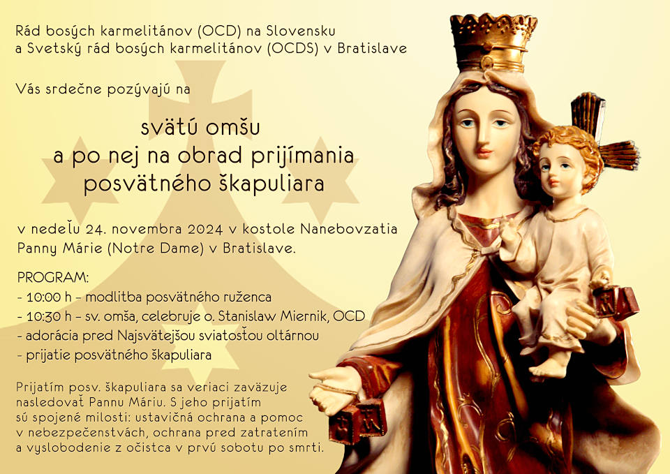 Rád bosých karmelitánov (OCD) na Slovensku a Svetský rád bosých karmelitánov (OCDS) v Bratislave Vás srdečne pozývajú na svätú omšu, po ktorej bude možnosť prijať posvätný škapuliar.